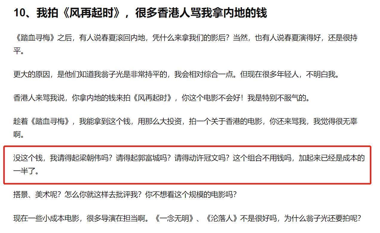 贵为影帝的梁朝伟,一部片酬可能都比普通人一辈子赚的钱还多。离开王家卫的泽东之后,梁朝伟的事业愈发红火。2023年的《风再起时》票房不算理想,导演翁子光当时发文透露,梁朝伟、郭富城、许冠文三个人拿走成本的一半,而业界盛传电影制作成本2亿,这意味着梁朝伟的片酬至少也有3000多万。